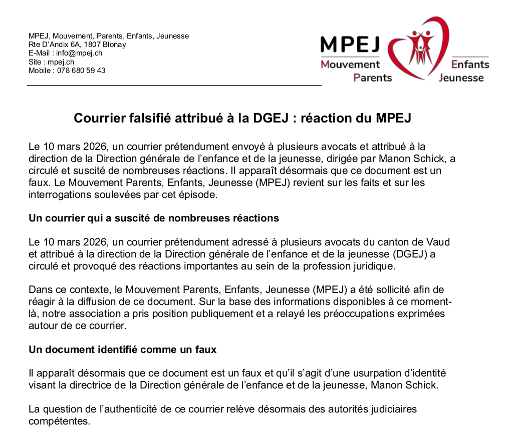 Courrier falsifié attribué à la DGEJ : réaction du MPEJ Courrier falsifié attribué à la DGEJ : réaction du MPEJ Information générale aux avocats vaudois